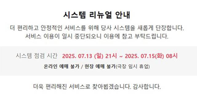 CJ CGV는 "차세대 시스템 이전 작업을 위해 14일 월요일 전국 모든 CGV 지점이 재정비 시간을 갖는다"고 설명했습니다.