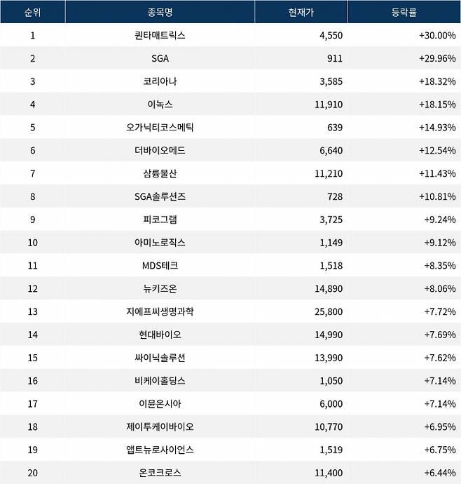 6위 더바이오메드(214610)는 현재가 6,640원으로 12.54% 상승 중이다. 7위 삼륭물산(014970)은 현재가 11,210원으로 11.43% 상승 중이다. 8위 SGA솔루션즈(184230)는 현재가 728원으로 10.81% 상승 중이다. 9위 피코그램(376180)은 현재가 3,725원으로 9.24% 상승 중이다. 10위 아미노로직스(074430)는 현재가 1,149원으로 9.12% 상승 중이다.