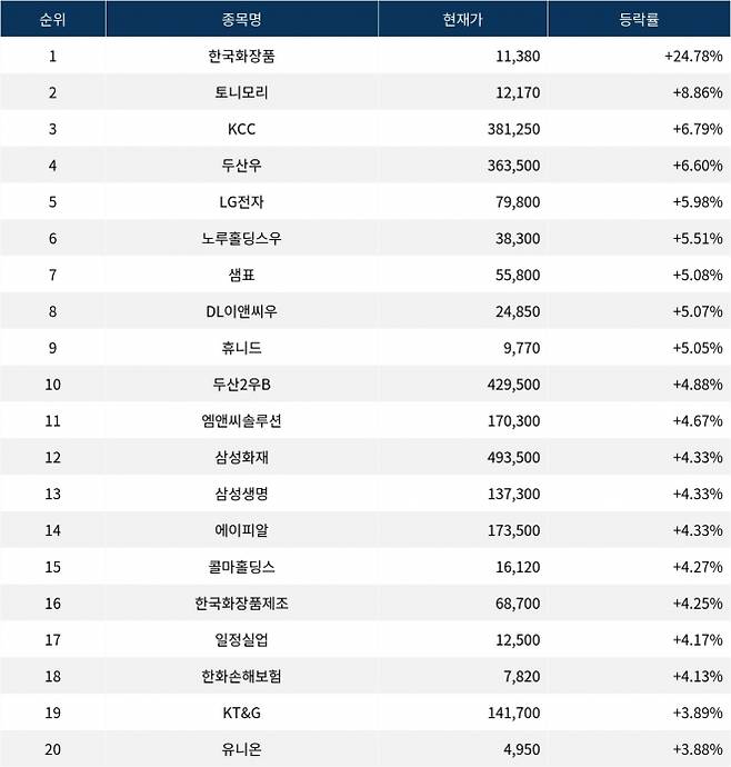 [서울데이터랩]한국화장품 24.78% 폭등…실시간 상승률 1위