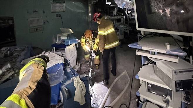 수술실 내부를 태운 불에서 연기가 나면서 5명이 연기를 마셔 응급실로 옮겨졌고, 환자와 의료진 등 40명이 스스로 대피한 것으로 잠정 집계됐습니다.