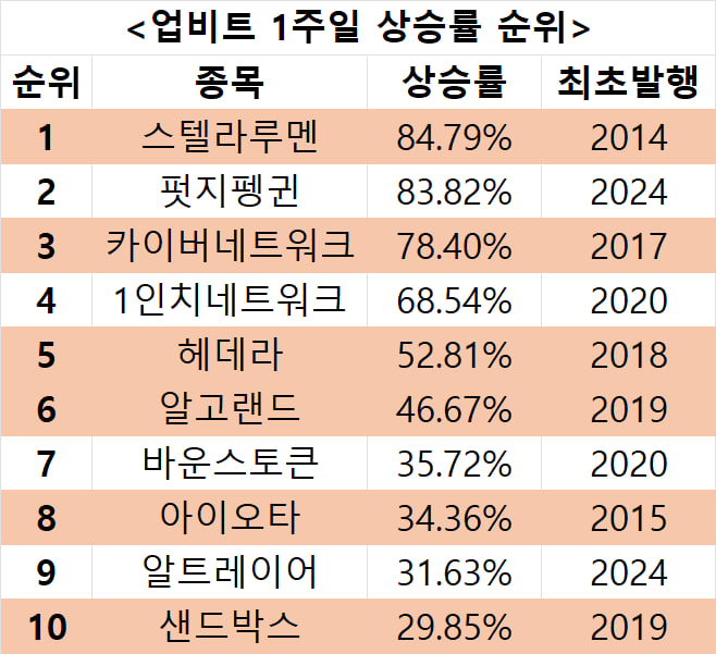 14일 업비트에 따르면 지난 일주일간 가장 많이 오른 코인은 스텔라루멘(XLM)으로 84.79% 상승했다.