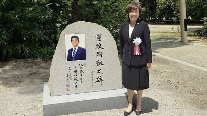아베 전 총리 3주기를 맞아 지난 6일 건립된 이 비석에는 부인 아키에 여사가 쓴 '헌정순난지비'(憲政殉難之碑·헌정을 위한 희생을 기리는 비석)라는 글씨와 아베 전 총리 사진 등이 삽입됐습니다.