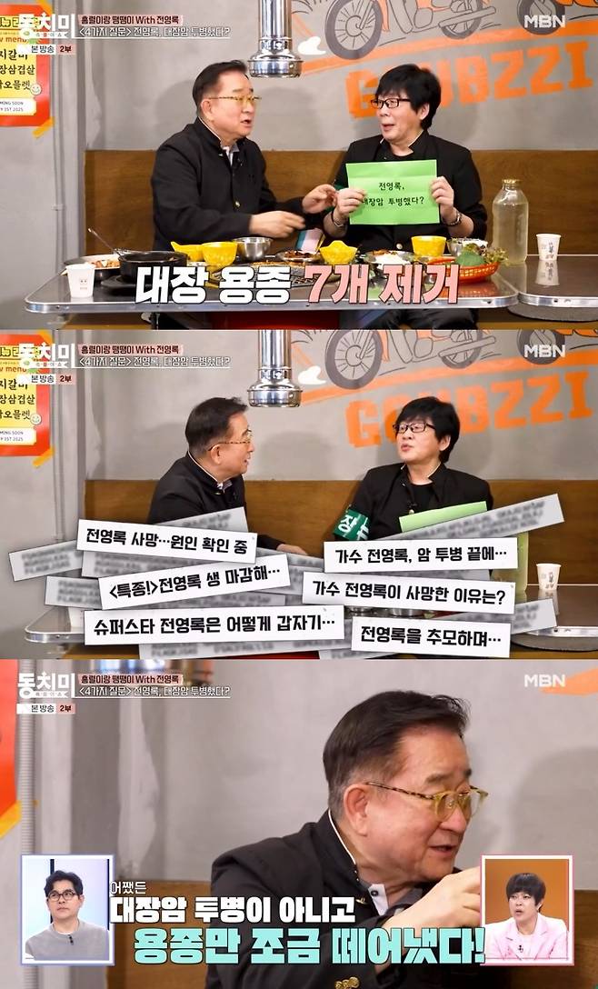 12일 방송된 MBN '속풀이쇼 동치미'에서는 전영록과 이홍렬이 출연해 만담을 나눴다. 이 가운데 전영록은 과거 대장암 투병설 및 사망설을 해명했다.