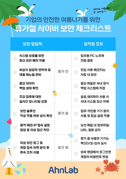 안랩은 기업·기관을 향한 사이버공격이 꾸준히 포착되는 추세에 맞춰 여름 휴가 전·중·후에 실천할 수 있는 '사이버보안 체크리스트'를 발표한다고 14일 밝혔다.