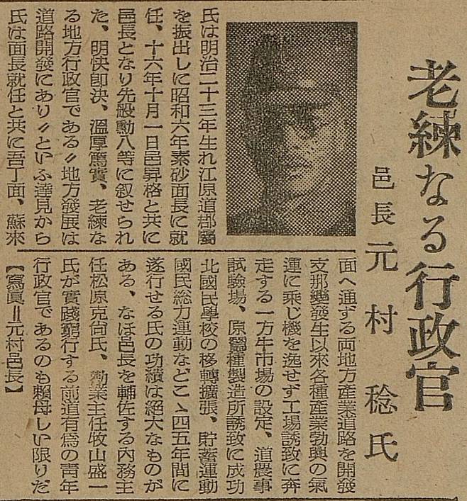 | ▲ 1942년 8월 5일 경성일보 기사 소사읍장 원촌임(창씨개명전 원영상)을 노련한 행정관으로 소개하고 있다 |