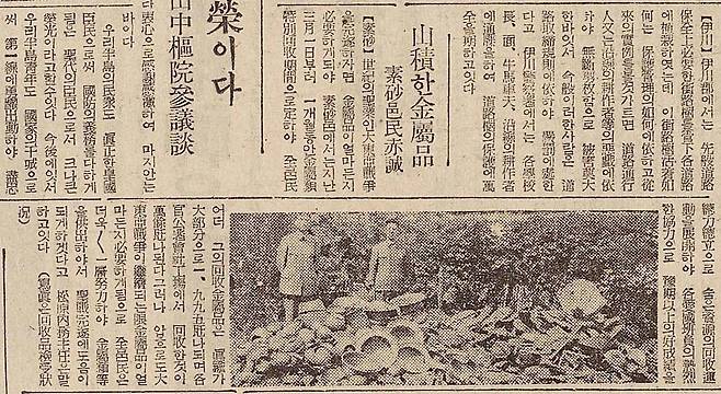 | ▲ 1942년 5월 15일 매일신보 기사 대동아전쟁을 완수하기 위해 소사읍에서 대대적으로 금속류를 회수하는데 금속품은 진유가 대부분으로 1,995천(? 킬로그램 천)을 회수하였으며, 각 관공서와 회사 공장에서 회수한 것이 만여천나 된다고 소개하고있다 |