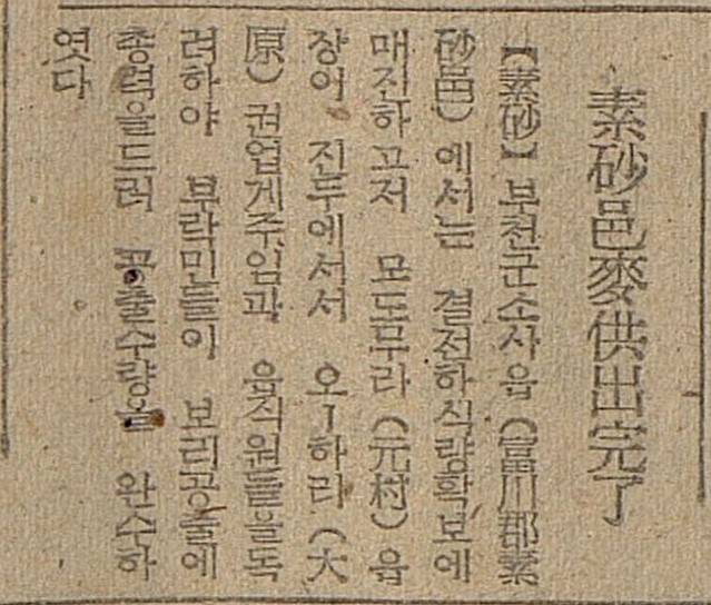 【소사】부천군 소사읍에서는 결전하 식량확보에 매진하고저 모도무라(元村)읍장이 진두에서서 오하라(大原) 권업계 주임과 읍직원들을 독려하야 부락민들이 보리공출에 총력을 들여 공출수량을 완수하였다. (1944년 7월 15일 매일신보)