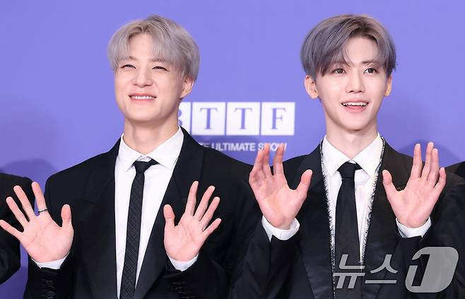 (서울=뉴스1) 권현진 기자 = 그룹 NCT DREAM(엔시티 드림, NCT 드림) 제노와 재민(오른쪽)이 14일 오전 서울 송파구 롯데시네마 월드타워에서 가진 정규 5집 ‘Go Back To The Future’(고 백 투 더 퓨처) 발매 기념 제작 발표회에서 포즈를 취하고 있다. 2025.7.14/뉴스1