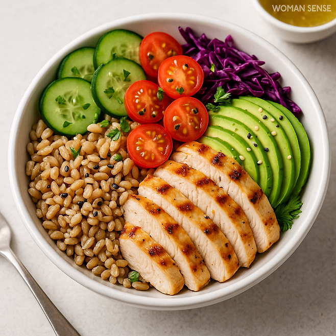 파로 1컵 (약 180g), 물 2컵 (약 480ml), 닭가슴살 1개 (약 200g) - 채식 옵션으로 두부나 병아리콩 사용 가능, 아보카도 1개, 오이 1개, 방울토마토 6개, 올리브 오일 1큰술, 레몬즙 1큰술, 간장 1작은술, 허브 (파슬리 또는 바질) 적당량, 소금, 후추 약간