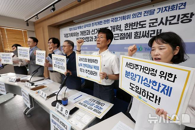 [서울=뉴시스] 조성우 기자 = 경제정의실천시민연합(경실련) 회원들이 14일 오전 서울 종로구 경실련 강당에서 열린 정치·외교·부동산 공약과 조직개편 관련 국정기획위 의견 전달 기자회견에서 각 요구 사항을 담은 내용의 피켓을 들고 구호를 외치고 있다. 2025.07.14. xconfind@newsis.com