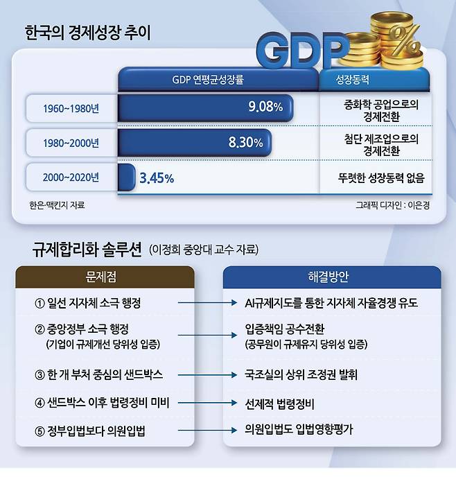 ▶중화학·첨단제조업 이후 2000년대 사라진 성장동력=송승헌 맥킨지앤드컴퍼니 한국오피스 대표는 14일 대한상의 회관에서 열린 ‘새정부 규제개혁 방향은?’ 토론회에서 “한국 경제가 새로운 성장을 만들기 위해서는 ‘규제 실패’를 인정하고 가장 큰 바위(규제)를 먼저 치워야 한다”고 말했다. 한국 사회가 근본적인 성장 동력 자체를 찾지 못하고 있는만큼, 기업의 성장을 핵심적으로 가로막고 있는 규제를 해소하는 큰 틀의 개혁이 필요하다는 이야기다.