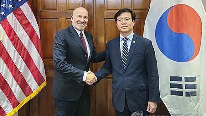 ▲ 여한구 산업통상자원부 통상교섭본부장이 지난 9일(현지시간) 미국 워싱턴 DC 상무부에서 하워드 러트닉 미국 상무부 장관과 악수하며 기념 촬영하고 있다.