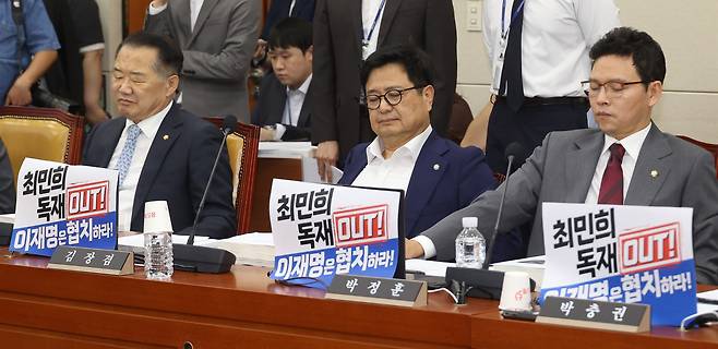 | ▲ 국민의힘 의원들이 14일 오후 국회 과학기술정보통신위원회 전체회의에서 열린 배경훈 과학기술정보통신부 장관 후보자의 인사청문회에서 지난 7일 더불어민주당 주도로 통과시킨 ‘방송 3법’(방송법·방송문화진흥회법·한국교육방송공사법) 개정안에 항의하며 '최민희 독재OUT', '이재명은 협치하라’는 피켓을 붙이고 참석했다. |