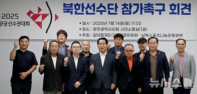 [광주=뉴시스] 김혜인 기자 = 14일 오전 광주 서구 광주시의회 시민소통실 1층에서 김대중재단기후환경위원회·남북스포츠나눔운동본부가 주최하는 '광주 2025 세계양궁선수권 대회 북한선수단 참가촉구 회견'이 열리고 있다. 2025.07.14. hyein0342@newsis.com