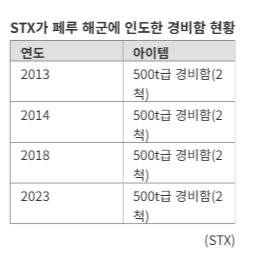 [파이낸셜뉴스]STX가 페루에 수출한 방산 규모는 누적 기준 약 1억3000만달러(한화 약 1800억 원)에 달하는 것으로 나타났다. 팬데믹 이전(2014~2018년) 한국이 '페루 방산 수입 1위(점유율 33.9%)'에 오를 수 있었던 비결이다. STX는 해군뿐 아니라 육군 장갑차 수출까지 성사시키며, 해상 방산에 이어 육상 방산 분야까지 영역을 넓혀 페루에서 K-방산의 대표주자로 자리매김했다는 평가다.