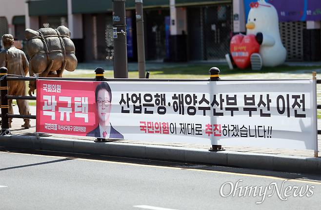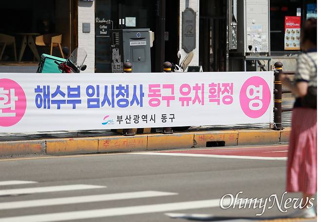 해양수산부 부산 임시청사 지역으로 부산 동구가 결정되자 국민의힘 곽규택(부산 서·동구) 국회의원, 부산 동구청이 곳곳에 환영 펼침막을 부착했다.