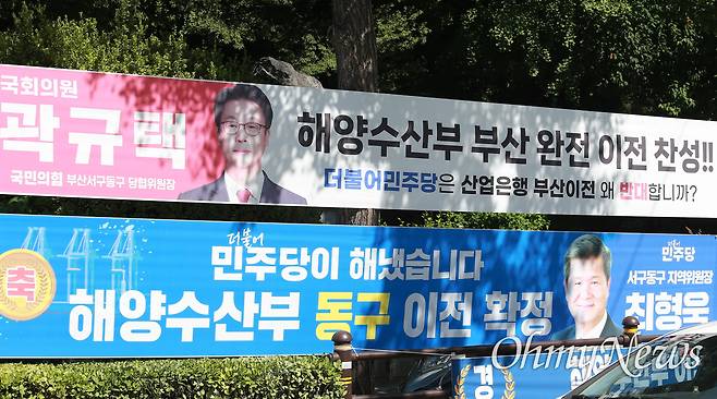 | ▲ 이재명 대통령의 대선 공약인 해양수산부 이전을 놓고 부산 동구에 임시청사가 마련되자 국민의힘 곽규택(부산 서동구) 국회의원과 부산 동구청이 환영 현수막을 곳곳에 내걸었다. |