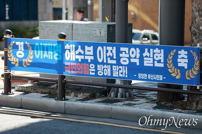| ▲ '임시청사 마련' 등 이재명 대통령이 대선공약인 해양수산부 부산 이전 추진 속도전에 나선 가운데 앞서 국민의힘 곽규택 의원이 내걸었던 '해수부 이전 완전 찬성, 더불어민주당은 산업은행 이전 왜 반대합니까' 현수막. |