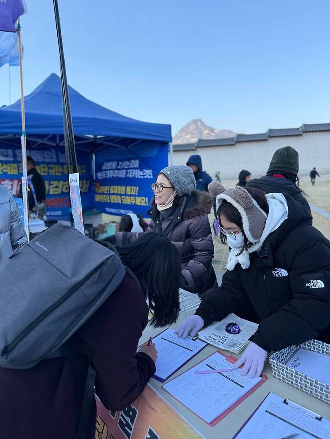 | ▲ 민간 고용평등상담실 재건 서명 여성노동자회는 탄핵 집회가 열렸던 기간 내내 광장에서 민간 고용평등상담실 재건을 위한 서명을 시민들에게 받았다. 총 10,074명의 시민이 서명에 참여해 주셨다.(2025. 2. 22) |
