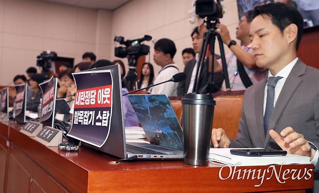 | ▲ '내란정당 아웃' 내건 민주당 14일 국회 여성가족위원회에서 열린 강선우 여성가족부 장관 후보자 인사청문회에서 국민의힘 의원들이 강 후보자의 사퇴를 요구하는 피켓을 붙이자, 더불어민주당 의원들도 '내란정당 아웃' 피켓을 내걸고 있다. |