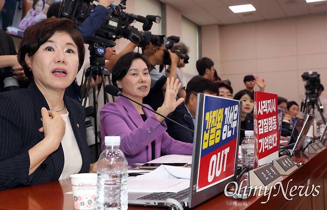 14일 오전 국회 여성가족위원회(여가위) 전체회의장에서 열린 청문회는 시작부터 여야 의원들 간 고성과 항의가 난무했다. 국민의힘 소속 이인선 여가위원장이 "인사청문회를 할 거면 (강 후보자가) 선서를 하고 (의원들이) 의사진행발언을 하는 게 맞다"라는 입장을 고수하자 민주당 의원들은 "선서 전 의사진행발언을 허락해달라"(임미애 의원), "얘길 들어주지도 않느냐"(김한규 의원)라고 항의했다.
