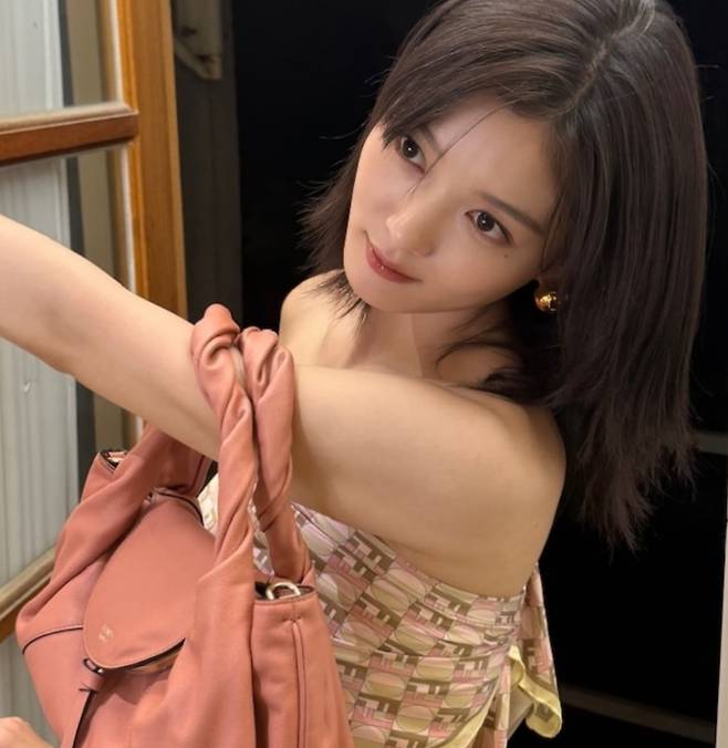 또한 핑크빛 토트백을 어깨에 걸쳐 스타일링에 포인트를 주며 세련된 도시 여인의 매력을 더했다.