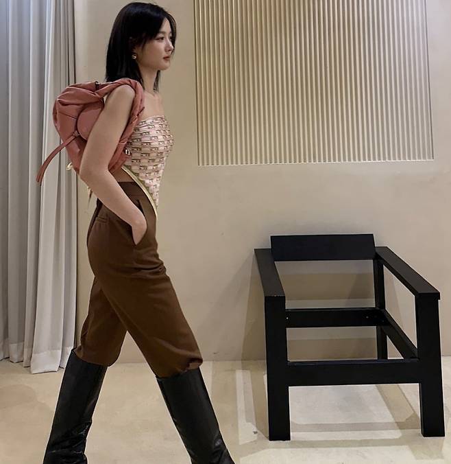 공개된 사진 속 그는 어깨를 드러낸 튜브톱 스타일의 스카프 탑에 브라운 팬츠, 블랙 롱부츠를 매치해 시크하면서도 고급스러운 분위기를 완성했다.