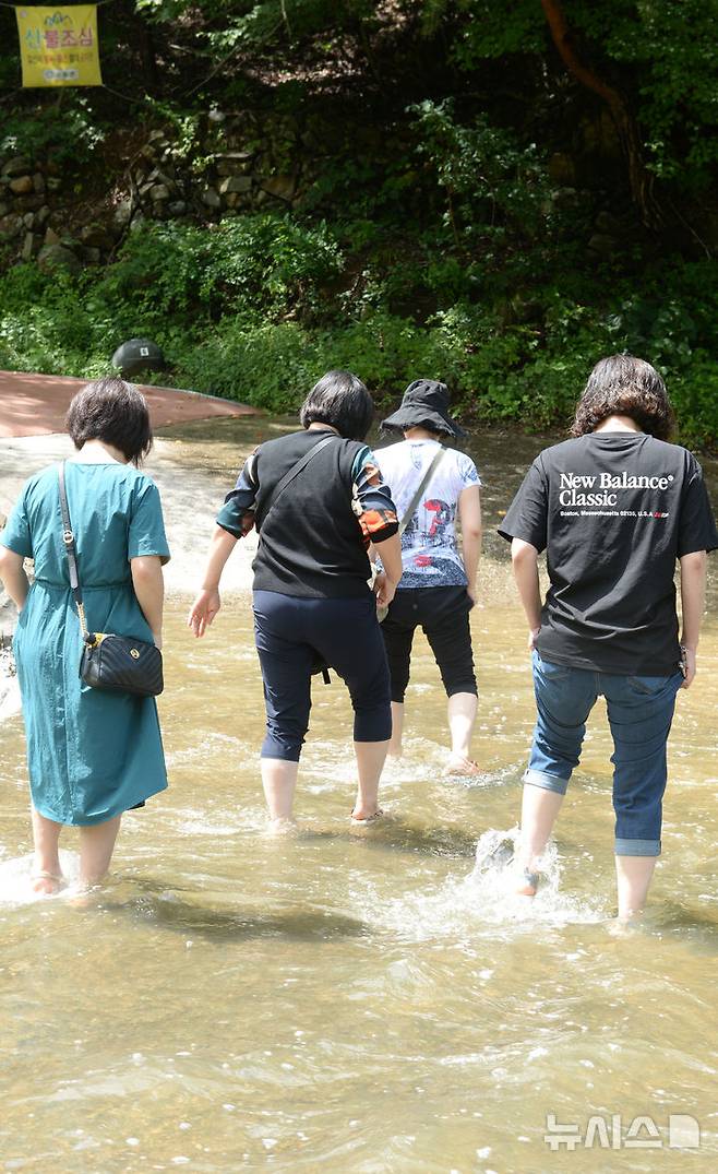 [울산=뉴시스] 배병수 기자 = 14일 유네스코 세계유산으로 등재 된 울산 울주군 천전리 명문화 암각화를 보기위해 시민들이 개울을 건너고 있다. 지난 12일 울주군 대곡리 ‘반구대 암각화’와 천전리 ‘명문화 암각화’가 유네스코 세계유산으로 등재됐다. 2025.07.14.bbs@newsis.com.