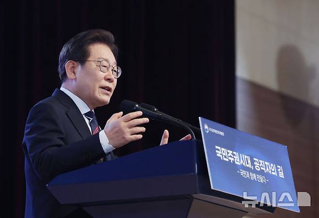 [진천=뉴시스] 최동준 기자 = 이재명 대통령이 14일 충북 진천 국가공무원인재개발원에서 5급 신임관리자과정 교육생에게 특강을 하고 있다. (대통령실통신사진기자단) 2025.07.14. photocdj@newsis.com
