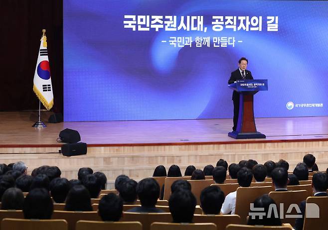 [진천=뉴시스] 최동준 기자 = 이재명 대통령이 14일 충북 진천 국가공무원인재개발원에서 5급 신임관리자과정 교육생에게 특강을 하고 있다. (대통령실통신사진기자단) 2025.07.14. photocdj@newsis.com