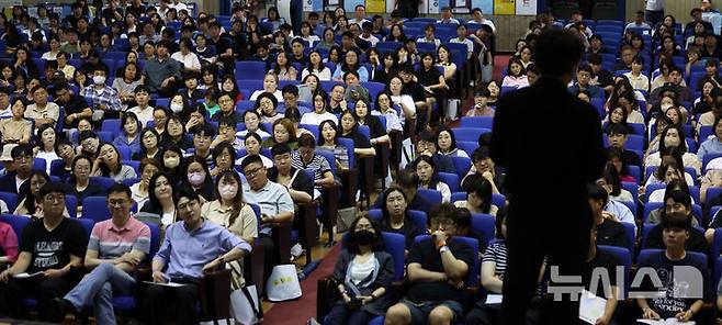 [서울=뉴시스] 김선웅 기자 = 14일 서울 송파구 교통회관에서 이투스에듀 운영 출판사 이투스북이 주최한 교사·강사 대상 입시 설명회에 참석한 교·강사들이 입시 설명을 경청하고 있다. 2025.07.14. mangusta@newsis.com