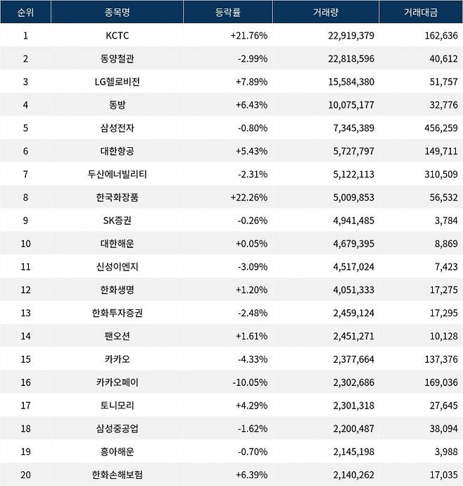 한편 거래량 상위 20위권 종목들은 신성이엔지(011930) ▼3.09%, 한화생명(088350) ▲1.20%, 한화투자증권(003530) ▼2.48%, 팬오션(028670) ▲1.61%, 카카오(035720) ▼4.33%, 카카오페이(377300) ▼10.05%, 토니모리(214420) ▲4.29%, 삼성중공업(010140) ▼1.62%, 흥아해운(003280) ▼0.70%, 한화손해보험(000370) ▲6.39% 등의 성적을 기록했다.