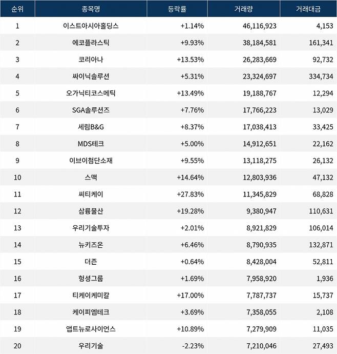한편 거래량 상위 20위권 종목들은 씨티케이(260930) ▲27.83%, 삼륭물산(014970) ▲19.28%, 우리기술투자(041190) ▲2.01%, 뉴키즈온(462310) ▲6.46%, 더즌(462860) ▲0.64%, 헝셩그룹(900270) ▲1.69%, 티케이케미칼(104480) ▲17.00%, 케이피엠테크(042040) ▲3.69%, 앱트뉴로사이언스(270520) ▲10.89%, 우리기술(032820) ▼2.23% 등의 성적을 기록하고 있다.