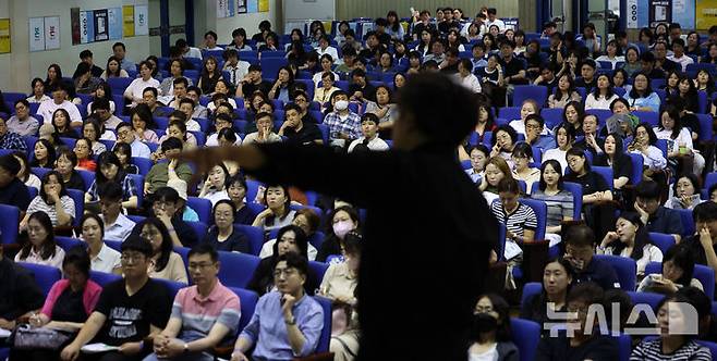 [서울=뉴시스] 김선웅 기자 = 14일 서울 송파구 교통회관에서 이투스에듀 운영 출판사 이투스북이 주최한 교사·강사 대상 입시 설명회에 참석한 교·강사들이 입시 설명을 경청하고 있다. 2025.07.14. mangusta@newsis.com