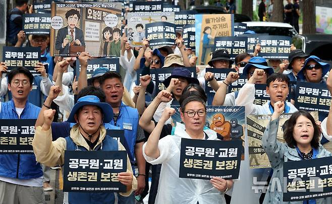 [서울=뉴시스] 추상철 기자 = 대한민국공무원노동조합총연맹(공노총)이 14일 오후 서울 종로구 정부서울청사 앞에서 '공무원 임금인상 쟁취 2차 간부결의대회'를 하고 있다. 2025.07.14. scchoo@newsis.com