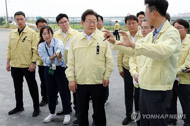 (청주=연합뉴스) 홍해인 기자 = 이재명 대통령이 오송 참사 2주기를 앞두고 14일 충북 청주시 오송읍 궁평2지하차도를 방문해 송호석 환경부 금강유역환경청장 등 실무 책임자들로부터 미호강 신규 제방 현황 브리핑을 받고 있다.