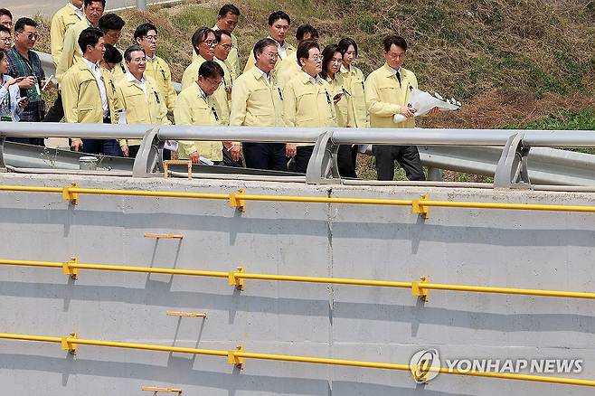 (청주=연합뉴스) 홍해인 기자 = 이재명 대통령이 오송 참사 2주기를 앞두고 14일 충북 청주시 오송읍 궁평2지하차도를 방문해 안전 점검을 위해 이동하고 있다.