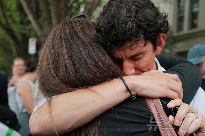 (워싱턴 AFP=뉴스1) 김경민 기자 = 해고된 미국 국무부 직원(왼쪽)이 11일(현지시간) 워싱턴에 있는 연방 청사 근처에서 열린 연방 직원 지지 집회에서 포옹을 받고 있다. 2025.7.11