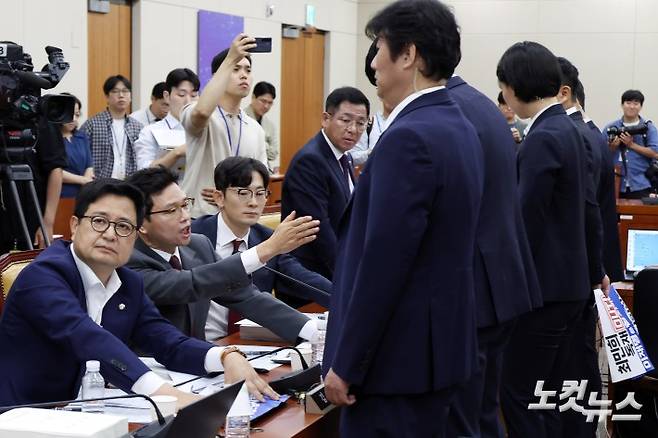 14일 오전 서울 여의도 국회 과학기술정보방송통신위원회에서 열린 배경훈 과학기술정보통신부 장관 후보자 인사청문회에서 국민의힘 의원들이 자리에 붙인 '최민희 위원장 규탄' 피켓을 최 위원장이 회의에 방해가 된다며 경위를 통해 제거하려 하자 국민의힘 의원들이 반발하고 있다.