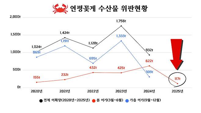 연평꽃게 수산물 위판 현황에 따르면 2025년 3월부터 6월까지 연평어장에서 잡힌 꽃게는 117t으로, 지난해 같은 기간(622t)과 비교해 약 81%줄었다. 최근 봄철 어획량인 2020년 155t, 2021년 232t, 2022년 432t, 2023년 425t과 비교하면 눈에 띄게 낮은 수치다.