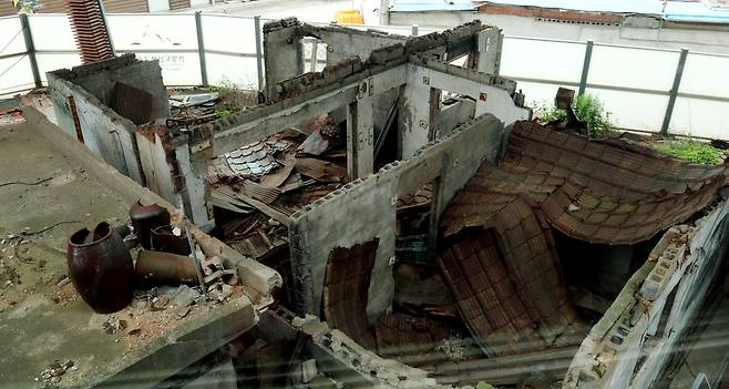 콘크리트 벽돌로 쌓은 벽은 군데군데 무너져 있었다. 금이 간 벽 사이로 철골 구조가 그대로 드러났다.