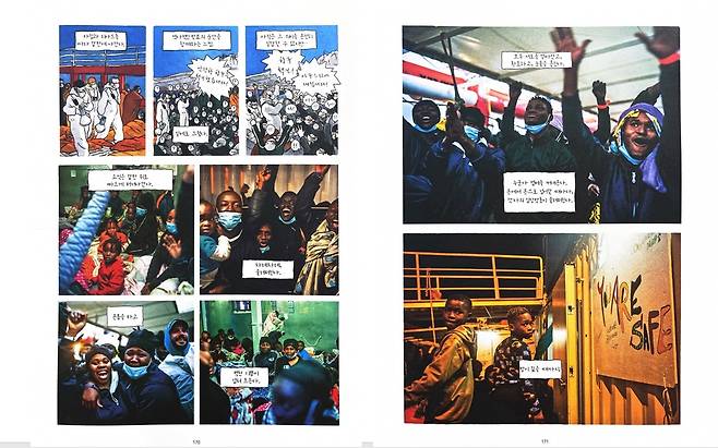 | ▲ 〈지중해의 끝, 파랑〉 170~171쪽. 난민들에게 머무를 수 있는 안전한 항구가 확보되었다는 소식이 전달되자 눈물을 흘리며 기뻐하는 장면이다. |