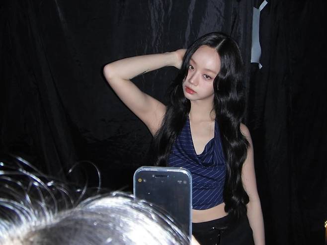 두 번째 착장에서는 스트라이프 패턴의 네이비 크롭 슬리브리스와 블랙 팬츠로 스타일을 바꿨다. 톤다운된 컬러감와 물결 웨이브 헤어는 시크한 분위기를 자아냈다.