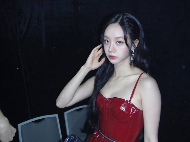 혜리는 버건디 칼러의 광택감 있는 코르셋 드레스를 착용해 날렵한 어깨 라인을 강조하는 슬리브리스 디자인에 상체를 잡아주는 실루엣이 세련미를 극대화했다.