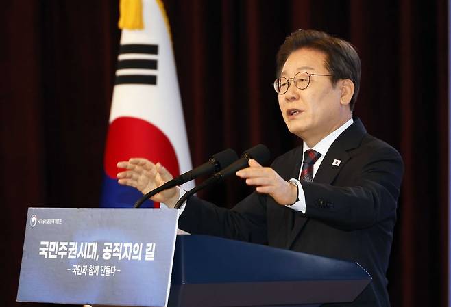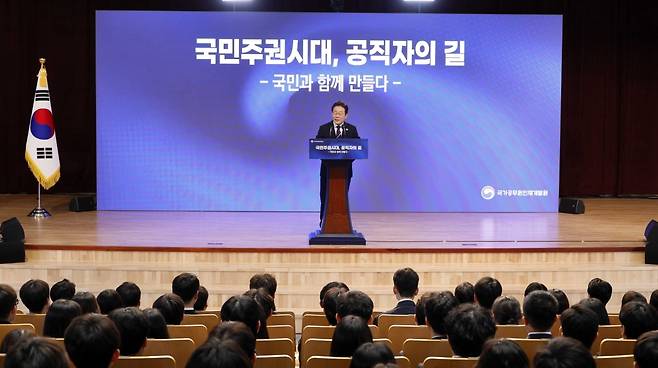 이재명 대통령이 14일 충북 진천 국가공무원인재개발원에서 70기 5급 신임관리자과정 교육생들에게 '국민주권시대, 공직자의 길'을 주제로 특강을 하고 있다.