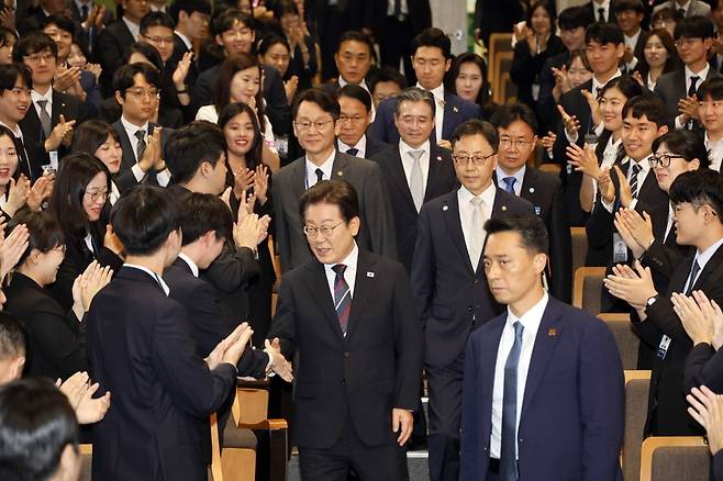 이재명 대통령이 14일 충북 진천 국가공무원인재개발원에서 70기 5급 신임관리자과정 교육생들에게 '국민주권시대, 공직자의 길'을 주제로 특강을 하기 위해 입장하고 있다.