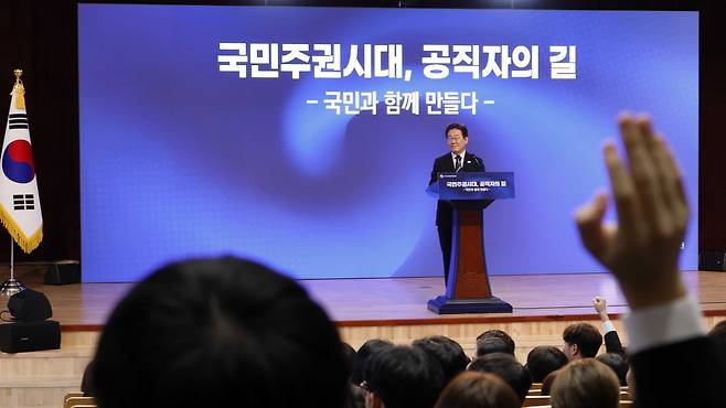 이재명 대통령이 14일 충북 진천 국가공무원인재개발원에서 70기 5급 신임관리자과정 교육생들에게 '국민주권시대, 공직자의 길'을 주제로 특강을 하며 질문을 받고 있다.