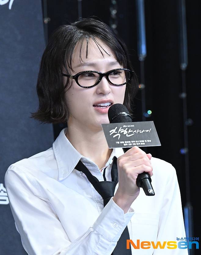 배우 류혜영이 7월 14일 오후 서울 구로구 신도림 더 링크 호텔에서 열린 JTBC 새 금요시리즈 '착한 사나이' 제작발표회에 참석해 인사말을 하고 있다.