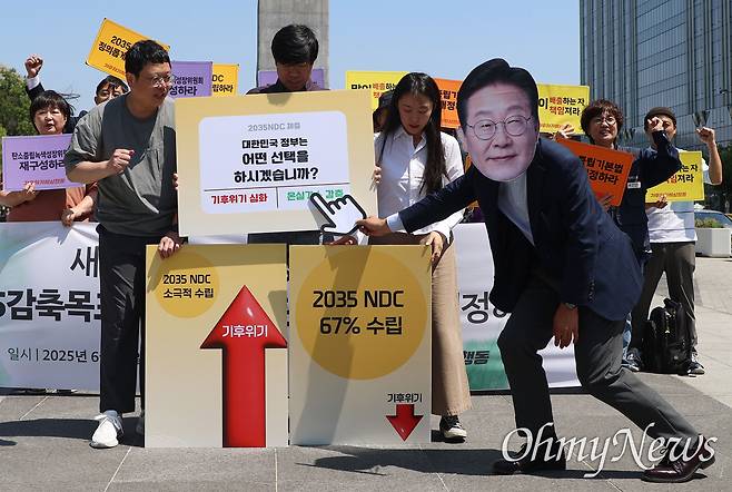 | ▲ 기후위기비상행동 회원들이 6월 11일 오전 서울 종로구 광화문광장에서 ‘새 정부가 기후정의 원칙에 기반한 2035년 국가 온실가스 감축목표(NDC)를 과학적 근거와 국제적 기준에 맞게 수립하고 기후위기 대응의 실효성을 담보할 수 있도록 ‘2035NDC 정의롭게 수립’ ‘탄소중립기본법 전면 개정’ ‘많이 배출하는 자, 많이 책임져라’ ‘탄소중립녹색성장위원회 재구성’ 등을 촉구했다. 이재명 대통령 가면을 쓴 한 참가자가 ’온실가스 감축’을 선택하는 퍼포먼스를 하고 있다. |