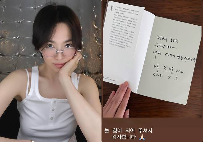 특히 눈길을 끄는 건, 박 전 회장이 송혜교를 위해 책 첫 장에 직접 남긴 친필 메시지다. 그는 "혜교의 오늘을 응원합니다. 내일은 오늘에서 만들어지니까"라며 따뜻한 응원의 말을 전했다.